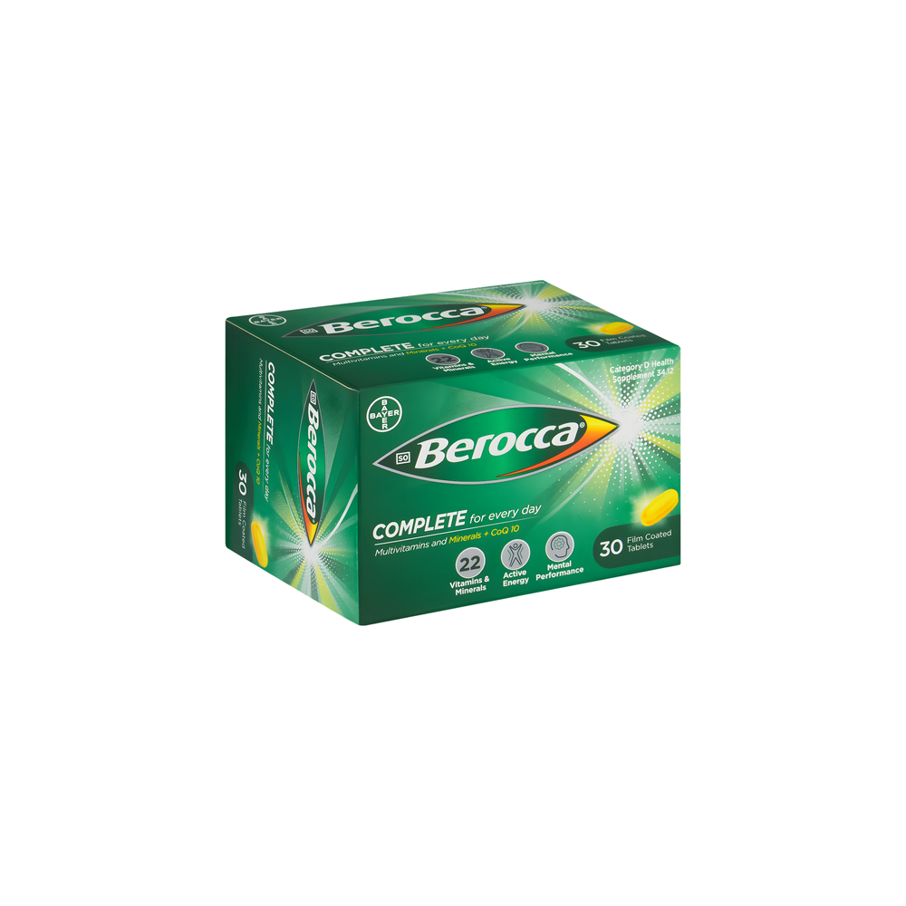Berocca Complete Multivitamin Film-Coated Tablets 30-Pack provide a comprehensive A–Z blend of vitamins and minerals to support overall health, mental performance and physical energy. With B vitamins, vitamin C, calcium, magnesium and zinc, plus antioxidants to help protect against oxidative stress and supports immune function.