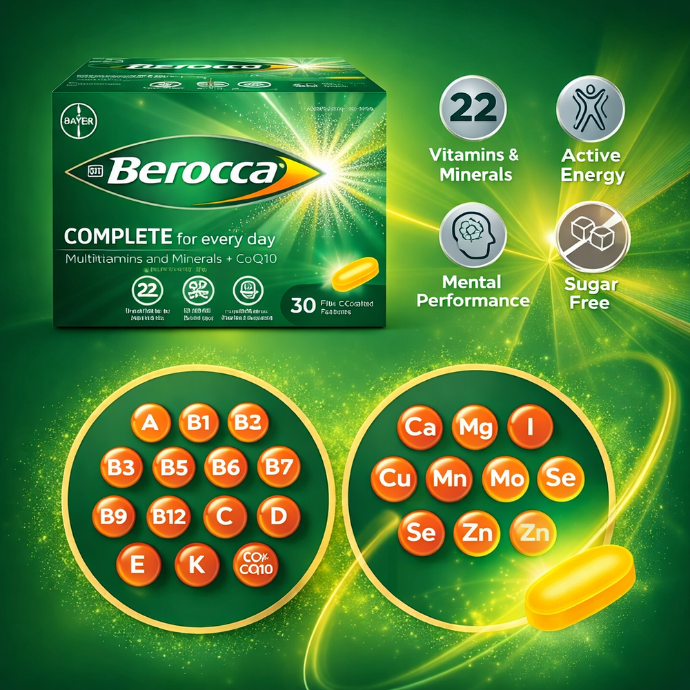 Berocca Complete film-coated tablets contain 13 vitamins, 9 minerals, and trace elements, along with CoQ10. These tablets provide comprehensive vitamins and minerals for overall health, mental performance, and physical energy.