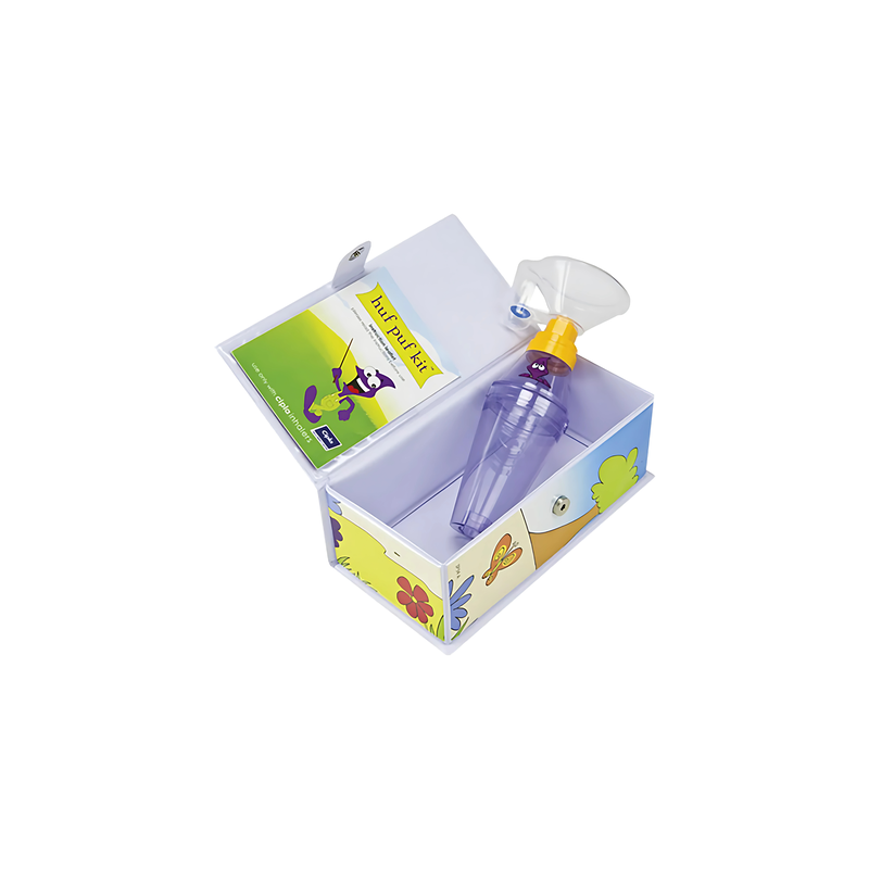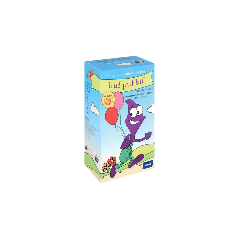Cipla Huf-puf-kit (cm452) The Huf Puf kit is specially designed to deliver medicine to children up to 4 years of age using an inhaler The Huf Puf kit is a ready-to-use inhaler extension kit, which includes a baby mask and zerostat vt spacer. The huf puf kit is specially designed to deliver medicine to children up to 4 years of age using an inhaler. It is an easy-to-use kit that makes it convenient for a child to obtain the full benefits of the medicine while breathing in and out normally. The shape of the mask provides a comfortable fit over a child’s face for breathing, and the transparent spacer allows you to keep a check on the dose released in the spacer. Specifications Use under medical supervision.